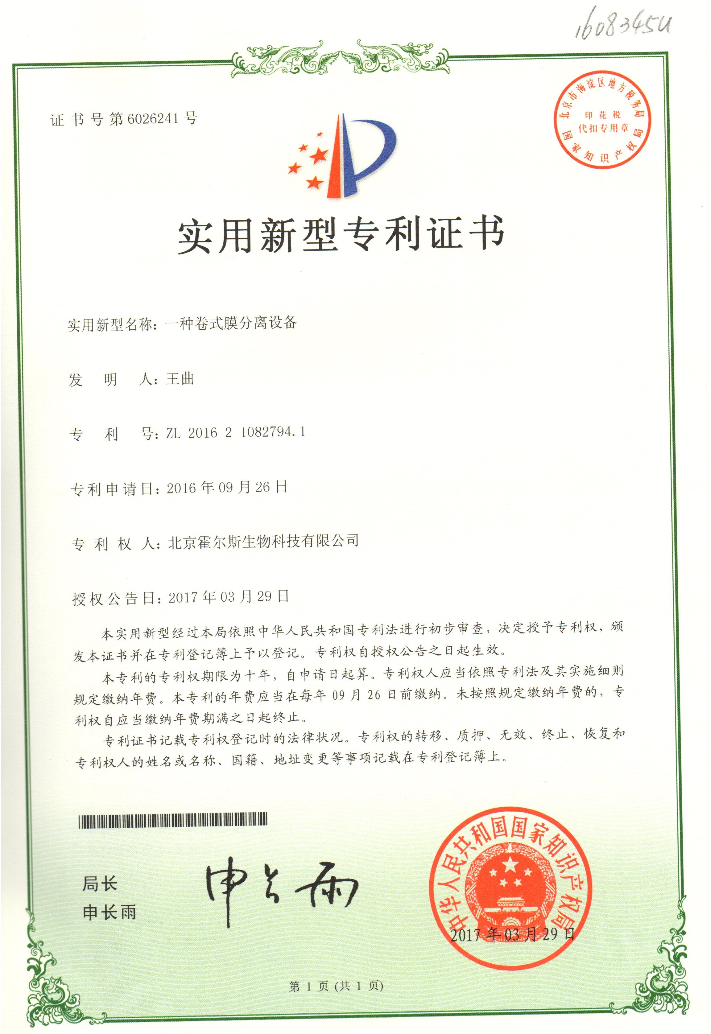 霍爾斯獲得膜分離設(shè)備的專利
